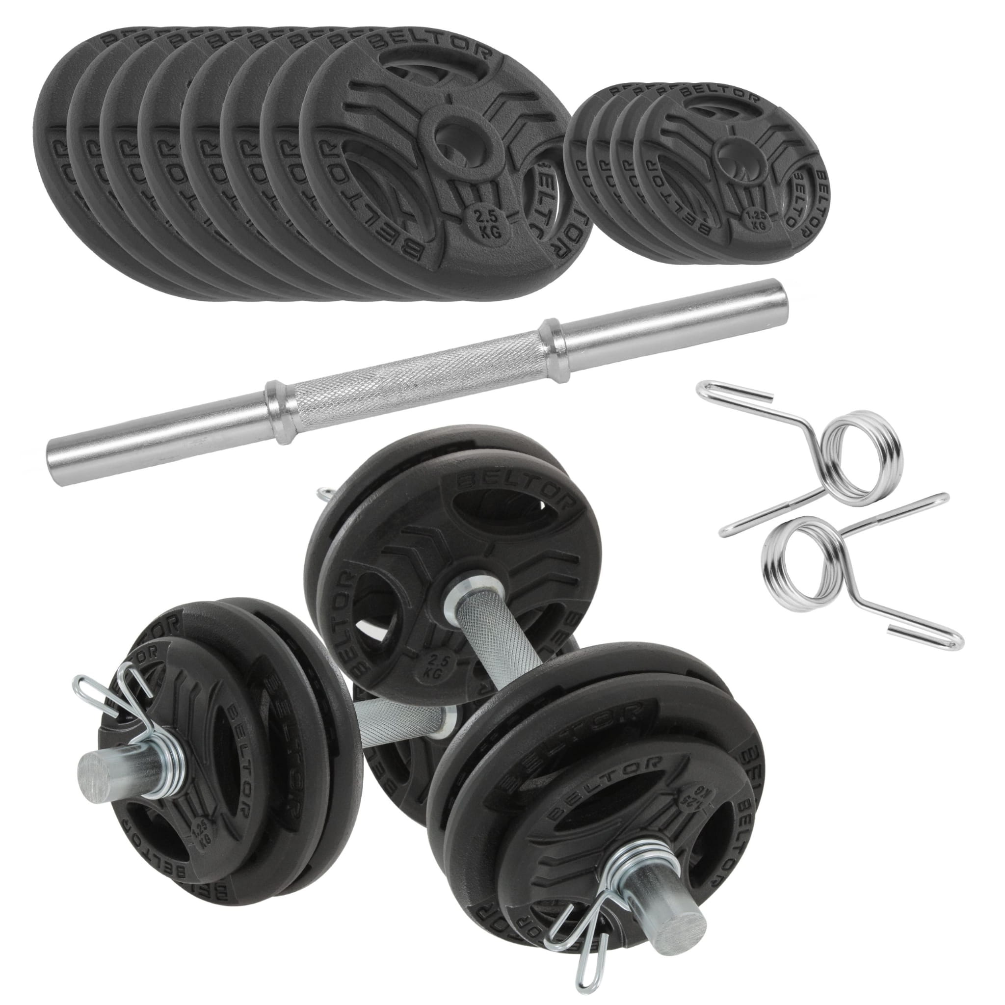 Regulowane hantle żeliwne 2x15kg + zaciski sprężynowe - Beltor