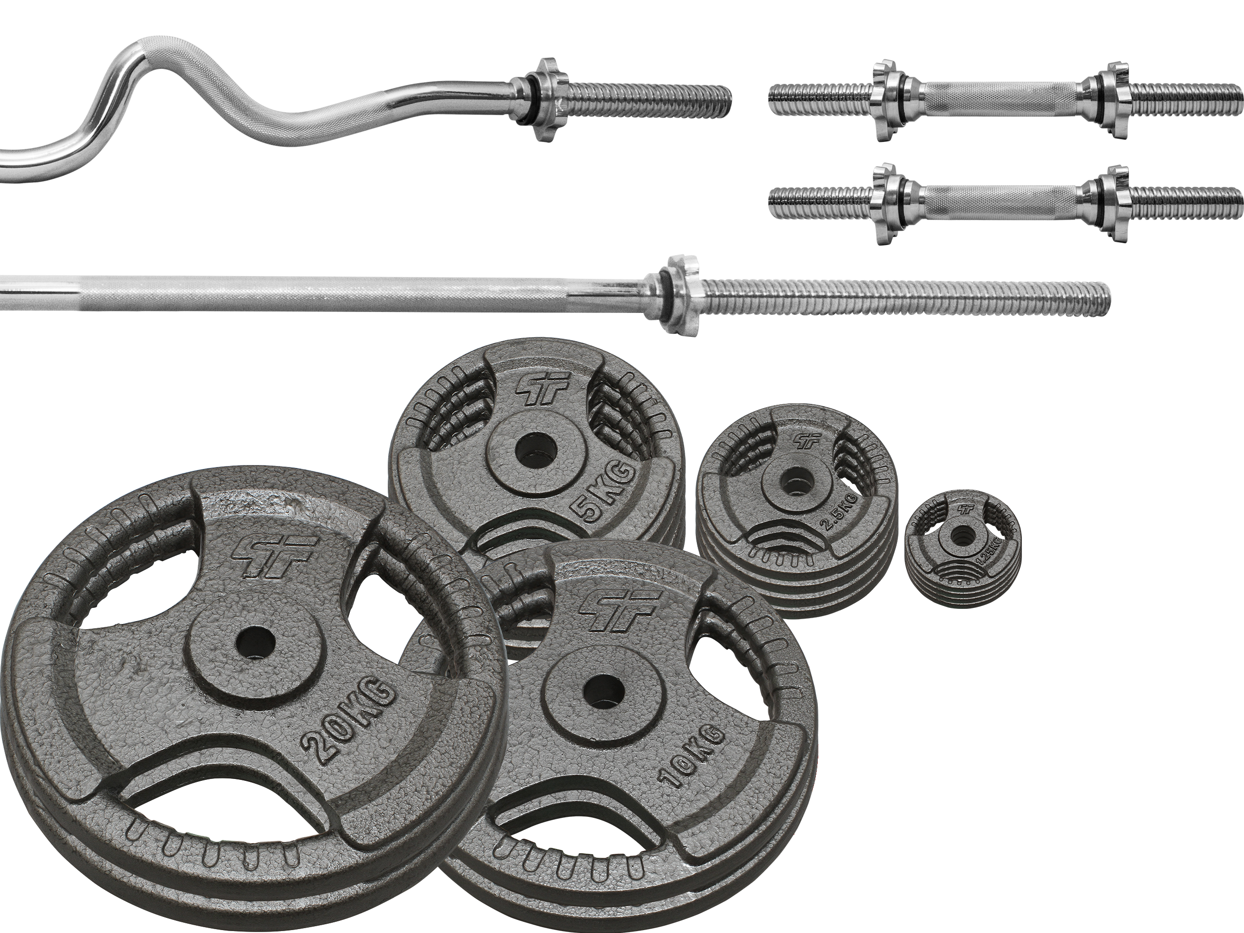 Hartowany gryf łamany podwójnie firmy Platinum Fitness o bardzo wysokiej jakości wykonania zapewnia doskonałe trzymanie w dłoniach dzięki nacięciom części chwytnej oraz bardzo długą eksploatację, a zaciski śrubowe zapewniają komfort i bezpieczeństwo podczas użytkowania oraz szybką i wygodną zmianę obciążeń.