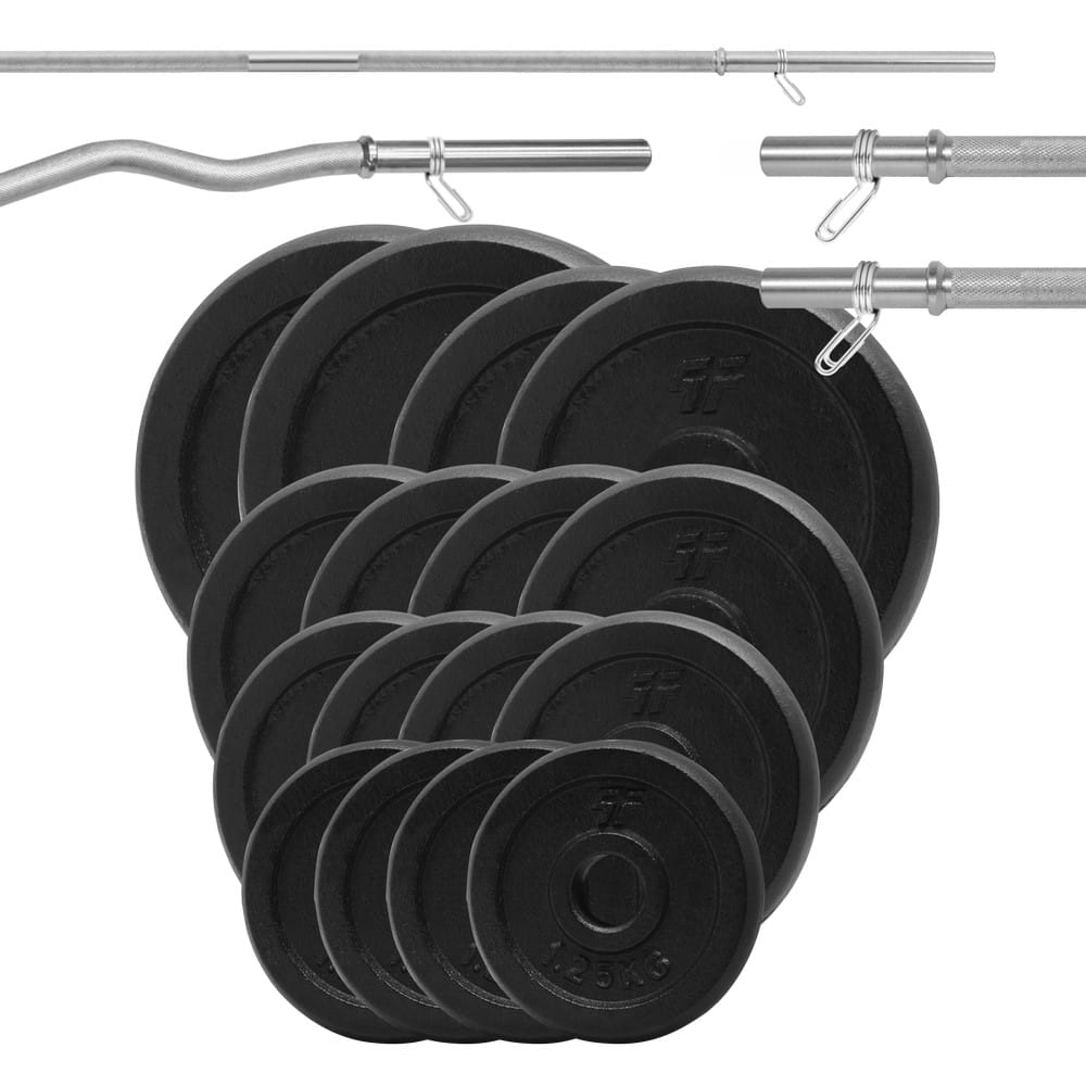 Zestaw 115kg obciążenia żeliwne krążek + gryf lekko łamany + gryf prosty 180cm + 2x gryfik 40cm 28mm - PlatinumFitness