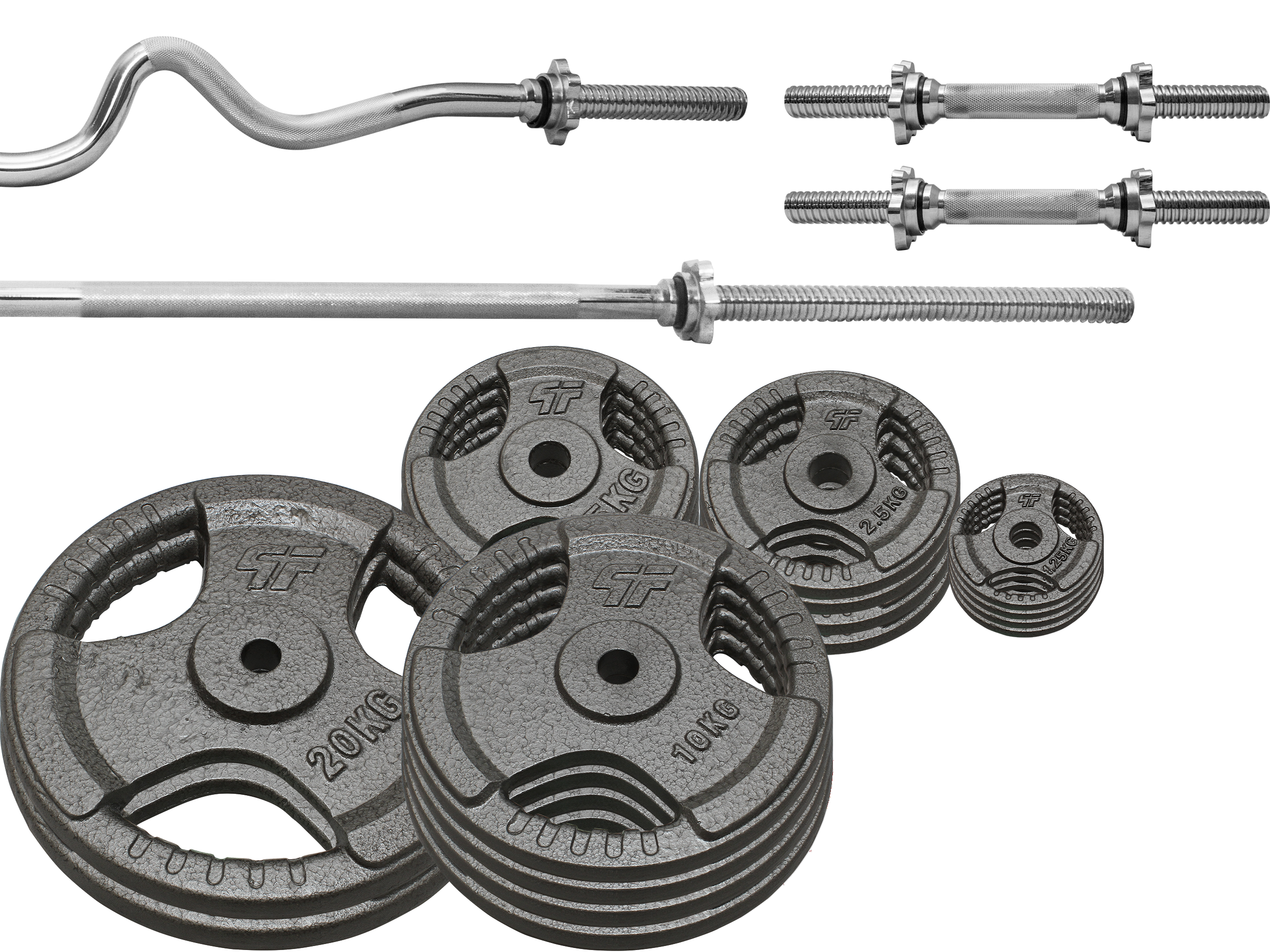 Hartowany gryf łamany podwójnie firmy Platinum Fitness o bardzo wysokiej jakości wykonania zapewnia doskonałe trzymanie w dłoniach dzięki nacięciom części chwytnej oraz bardzo długą eksploatację, a zaciski śrubowe zapewniają komfort i bezpieczeństwo podczas użytkowania oraz szybką i wygodną zmianę obciążeń.