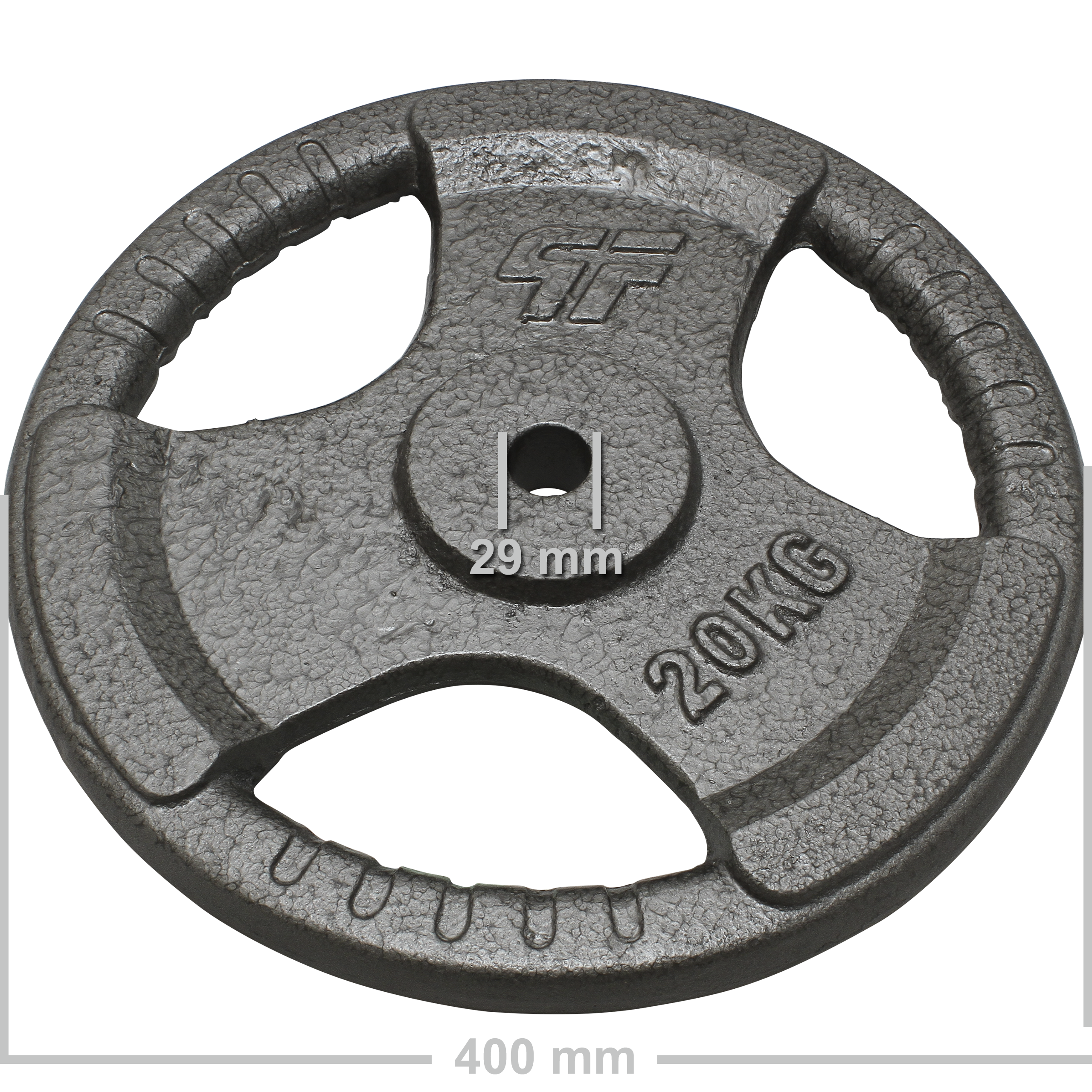 Żeliwne talerze o konstrukcji Tri-Grip, która pozwala na szybką zmianę na sztandze lub gryfie