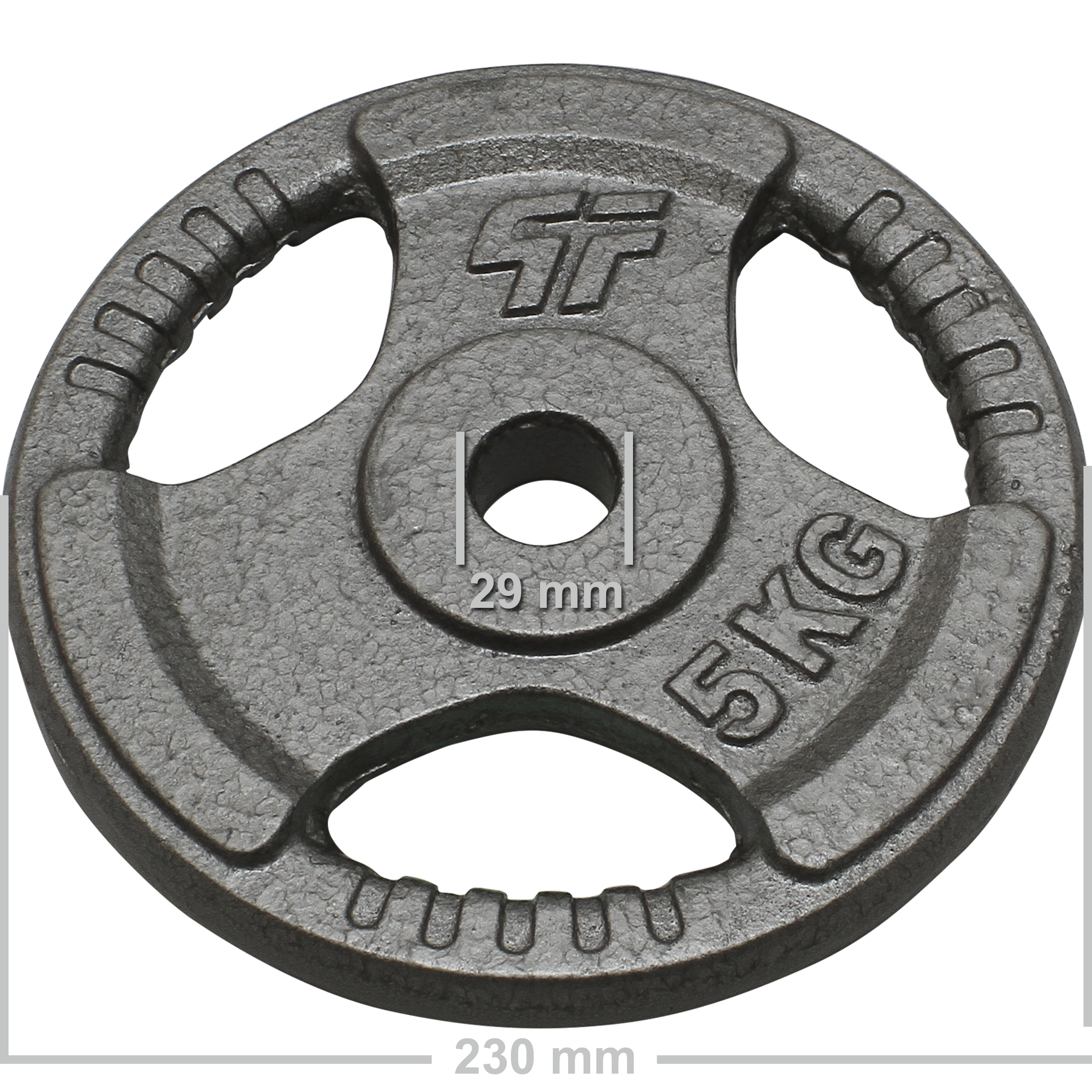 Żeliwne talerze o konstrukcji Tri-Grip, która pozwala na szybką zmianę na sztandze lub gryfie