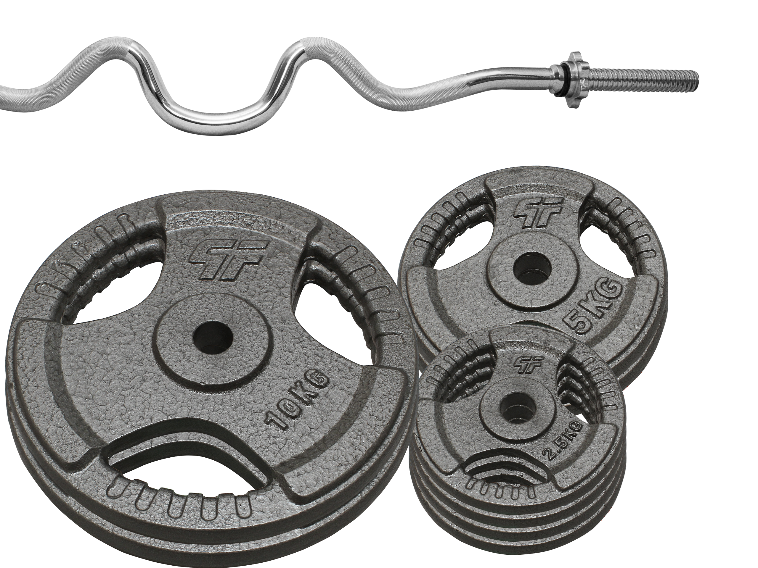 Hartowany gryf łamany podwójnie firmy Platinum Fitness o bardzo wysokiej jakości wykonania zapewnia doskonałe trzymanie w dłoniach dzięki nacięciom części chwytnej oraz bardzo długą eksploatację, a zaciski śrubowe zapewniają komfort i bezpieczeństwo podczas użytkowania oraz szybką i wygodną zmianę obciążeń.
