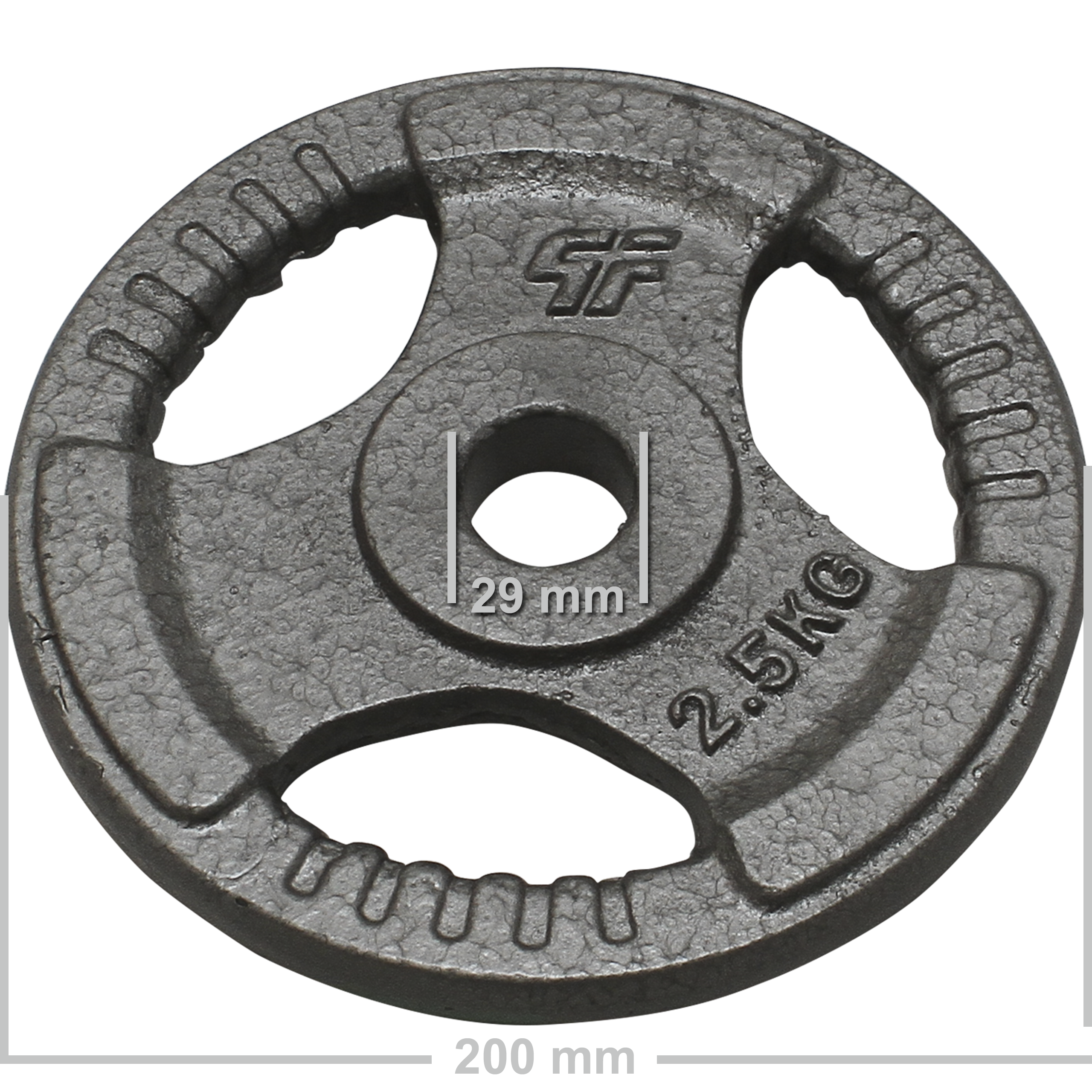 Żeliwne talerze o konstrukcji Tri-Grip, która pozwala na szybką zmianę na sztandze lub gryfie