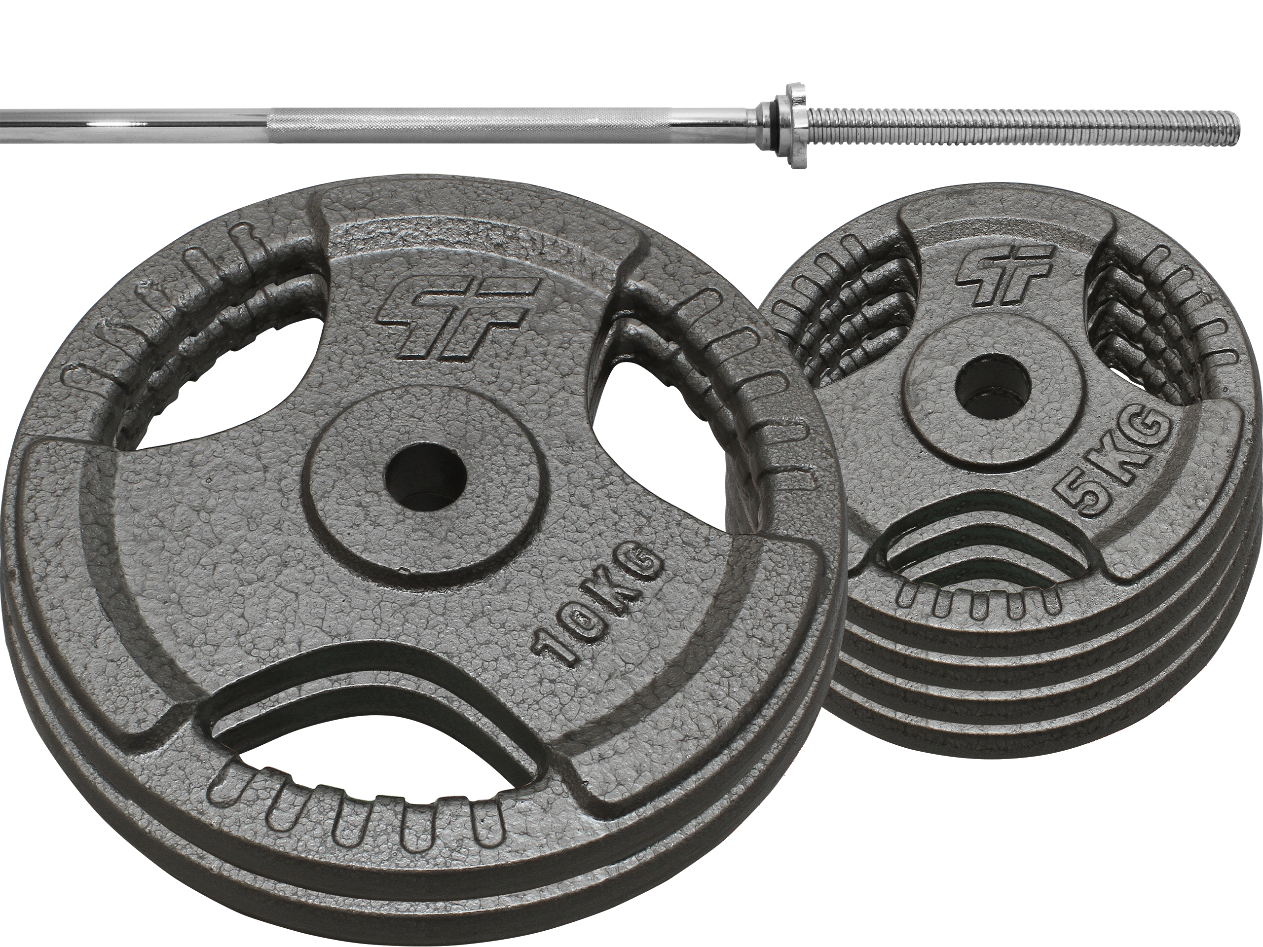Żeliwne talerze o konstrukcji Tri-Grip, która pozwala na szybką zmianę na sztandze lub gryfie