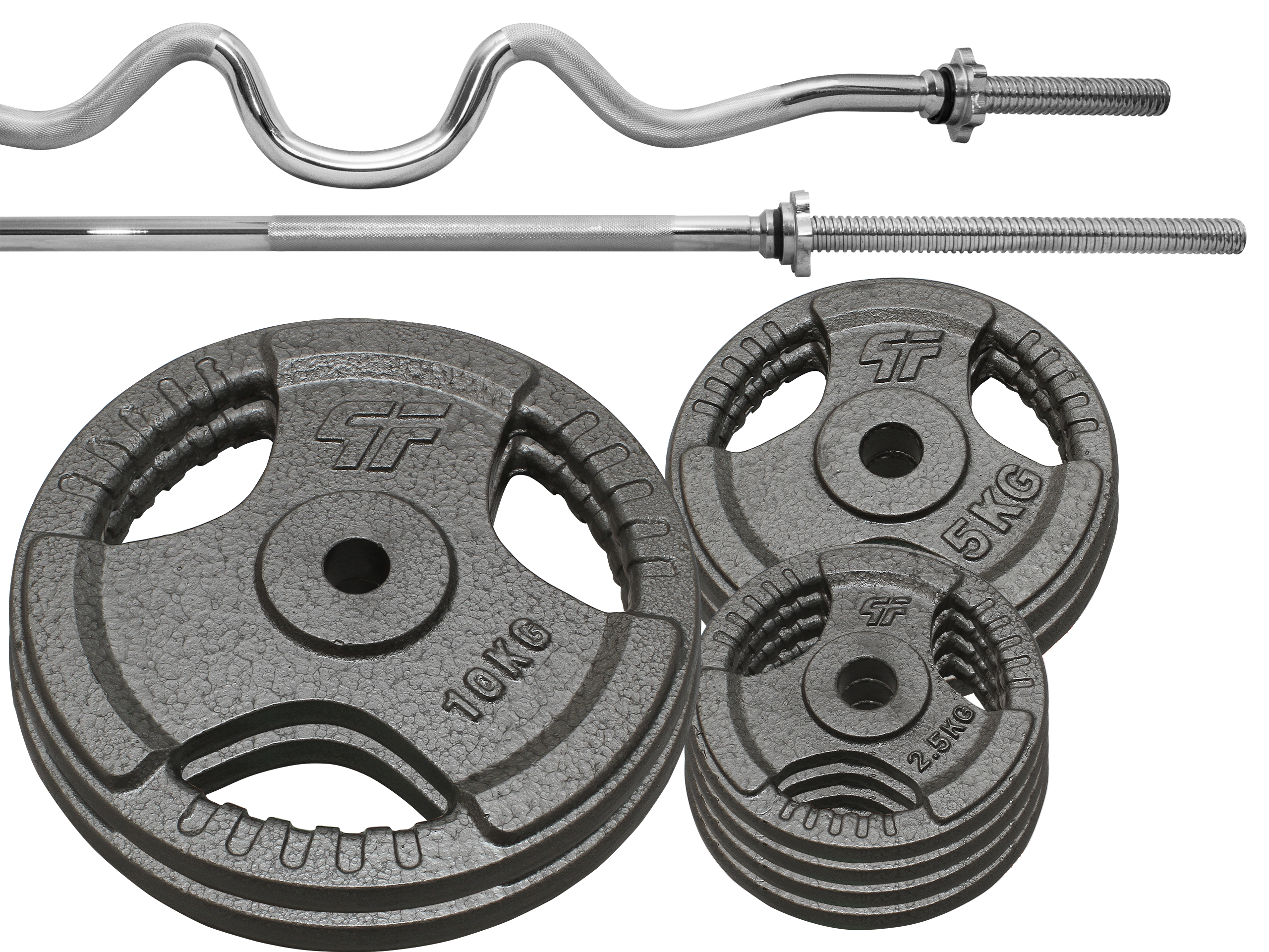 Hartowany gryf łamany podwójnie firmy Platinum Fitness o bardzo wysokiej jakości wykonania zapewnia doskonałe trzymanie w dłoniach dzięki nacięciom części chwytnej oraz bardzo długą eksploatację, a zaciski śrubowe zapewniają komfort i bezpieczeństwo podczas użytkowania oraz szybką i wygodną zmianę obciążeń.