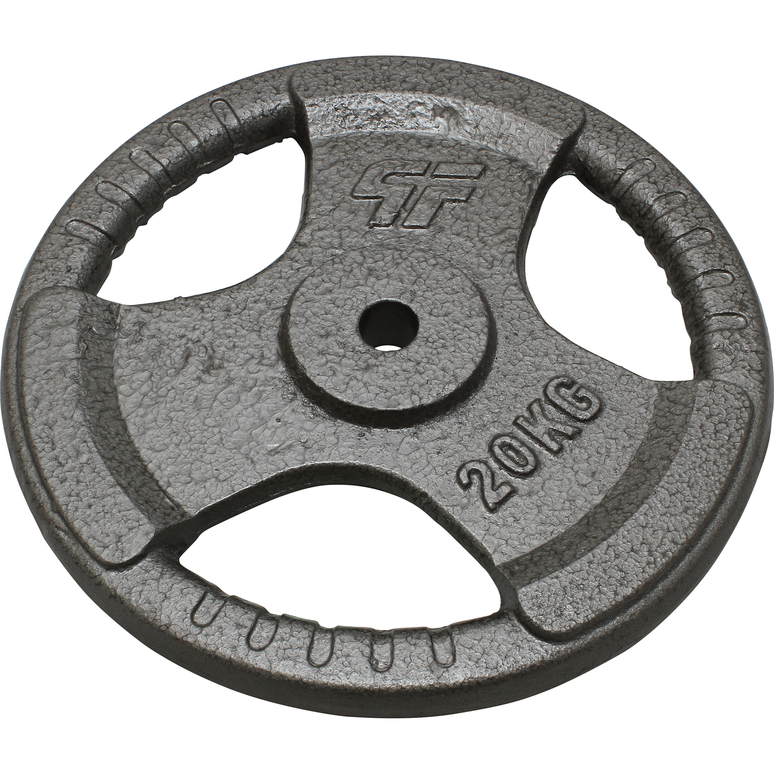 Żeliwne talerze o konstrukcji Tri-Grip, która pozwala na szybką zmianę na sztandze lub gryfie
