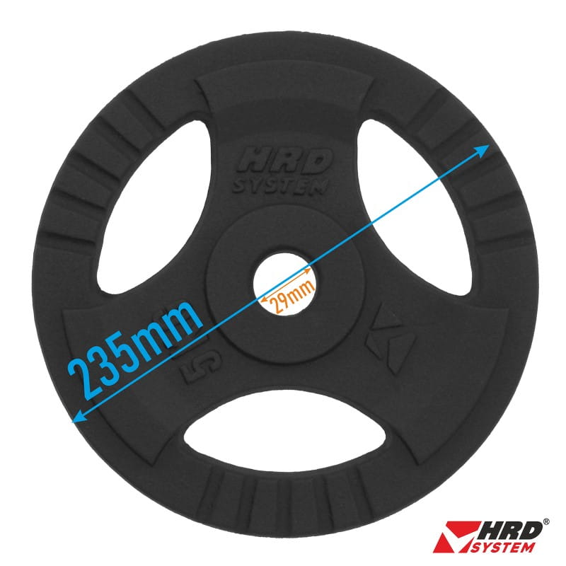 Żeliwne talerze o konstrukcji Tri-Grip, która pozwala na szybką zmianę na sztandze lub gryfie