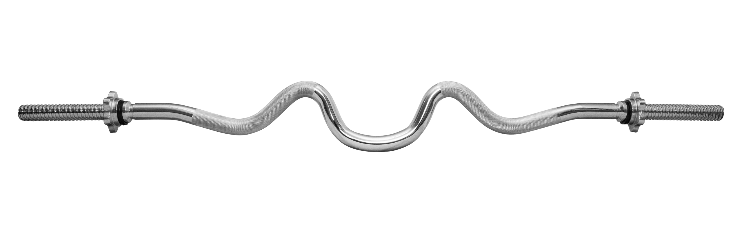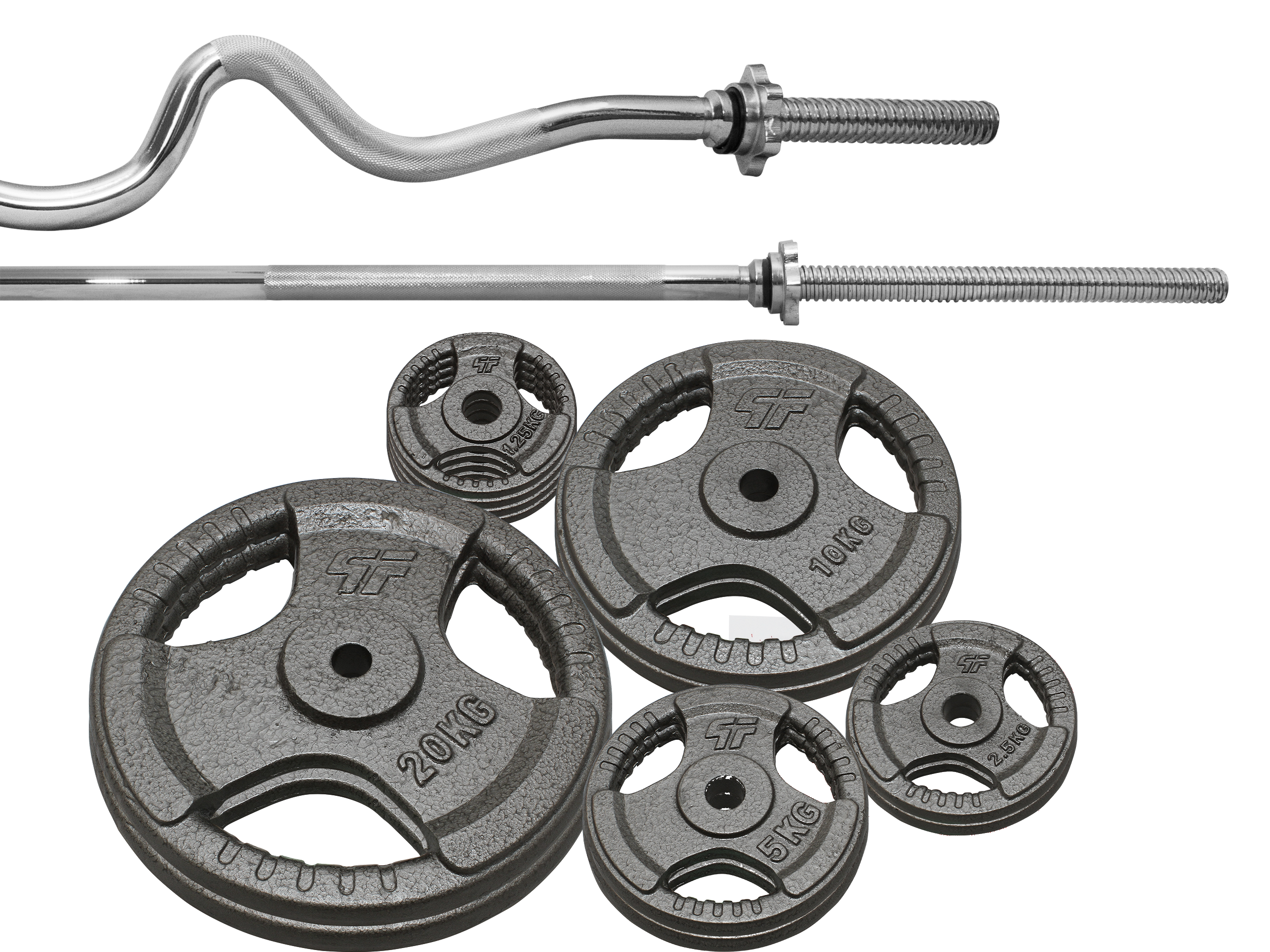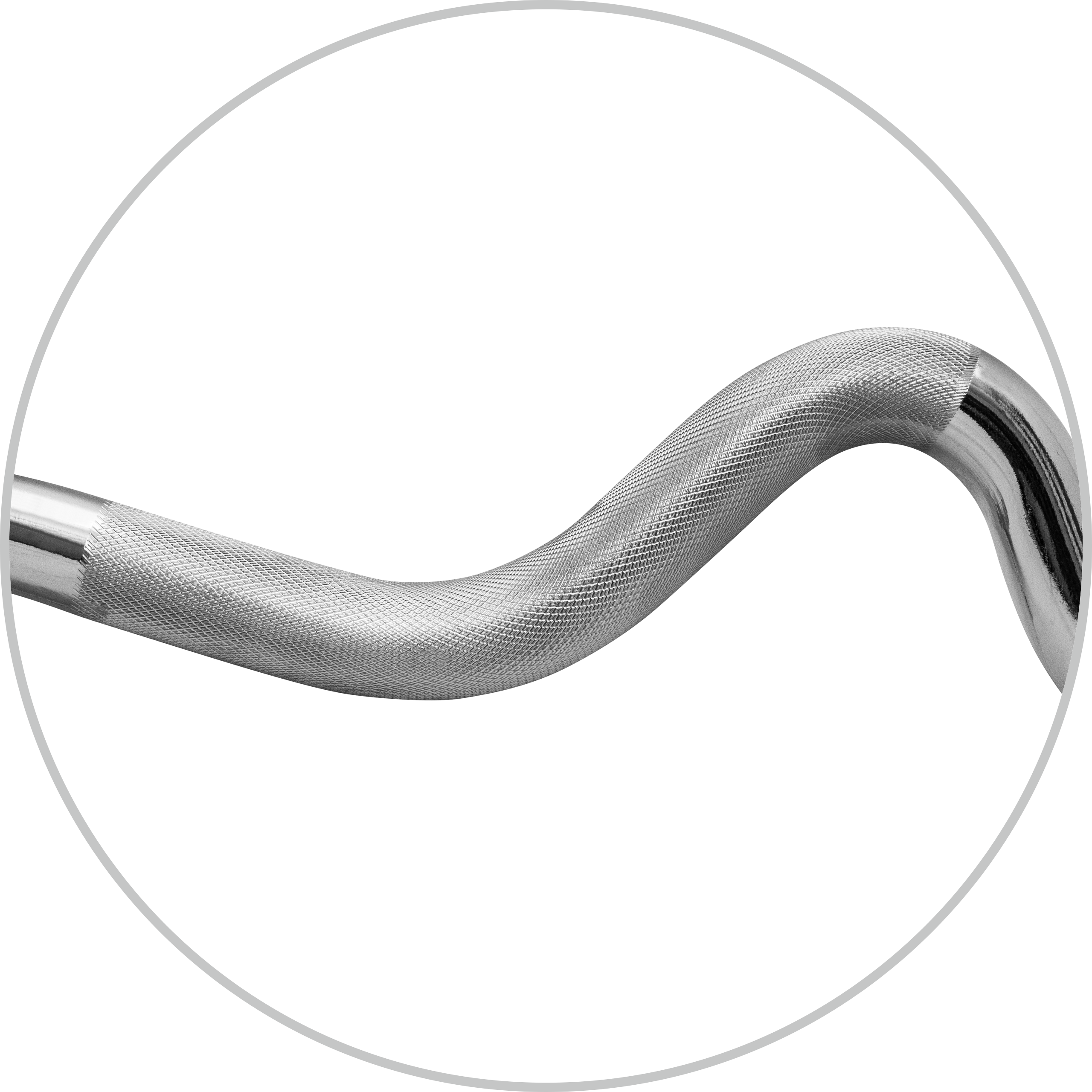 Hartowany gryf łamany podwójnie firmy Platinum Fitness o bardzo wysokiej jakości wykonania zapewnia doskonałe trzymanie w dłoniach dzięki nacięciom części chwytnej oraz bardzo długą eksploatację, a zaciski śrubowe zapewniają komfort i bezpieczeństwo podczas użytkowania oraz szybką i wygodną zmianę obciążeń.